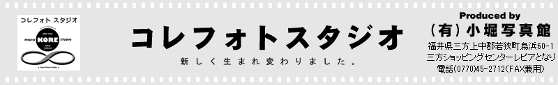 【店舗名】 コレフォトスタジオ 【会社名】 有限会社 小堀写真館 【代表取締役】 小堀 峰夫 【所在地】 福井県三方上中郡若狭町鳥浜60-1 三方ショッピングセンターレピアとなり 電話(0770)45-2712(FAX兼用) 【E-mail】 info@kore-photo-studio.com |